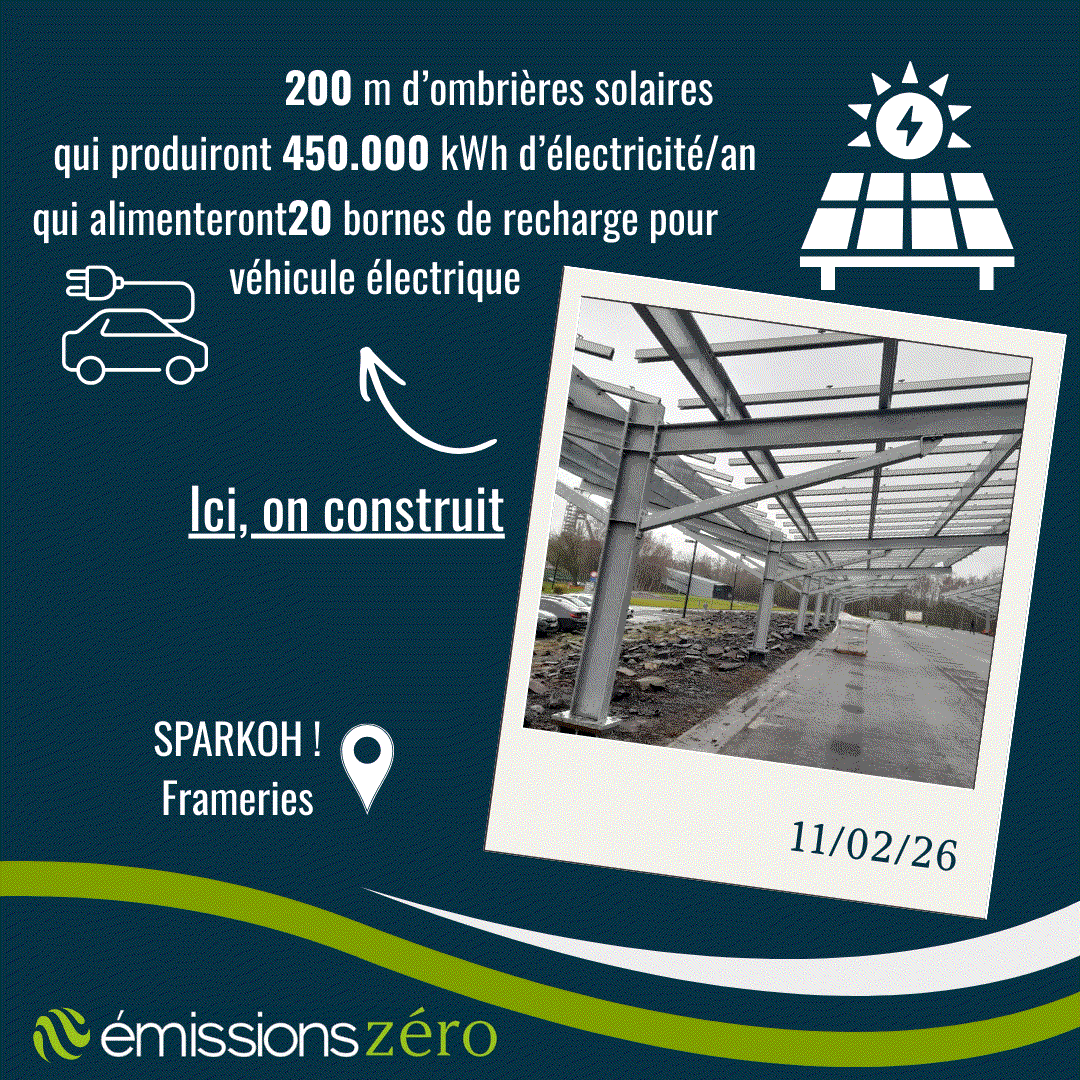 Notre projet d’ombrières solaires sur le site du parc scientifique SPARKOH ! à Frameries a franchi une nouvelle étape importante : les structures sont désormais posées et les panneaux photovoltaïques seront installés dans les prochaines semaines par les équipes d’Enersol SRL.